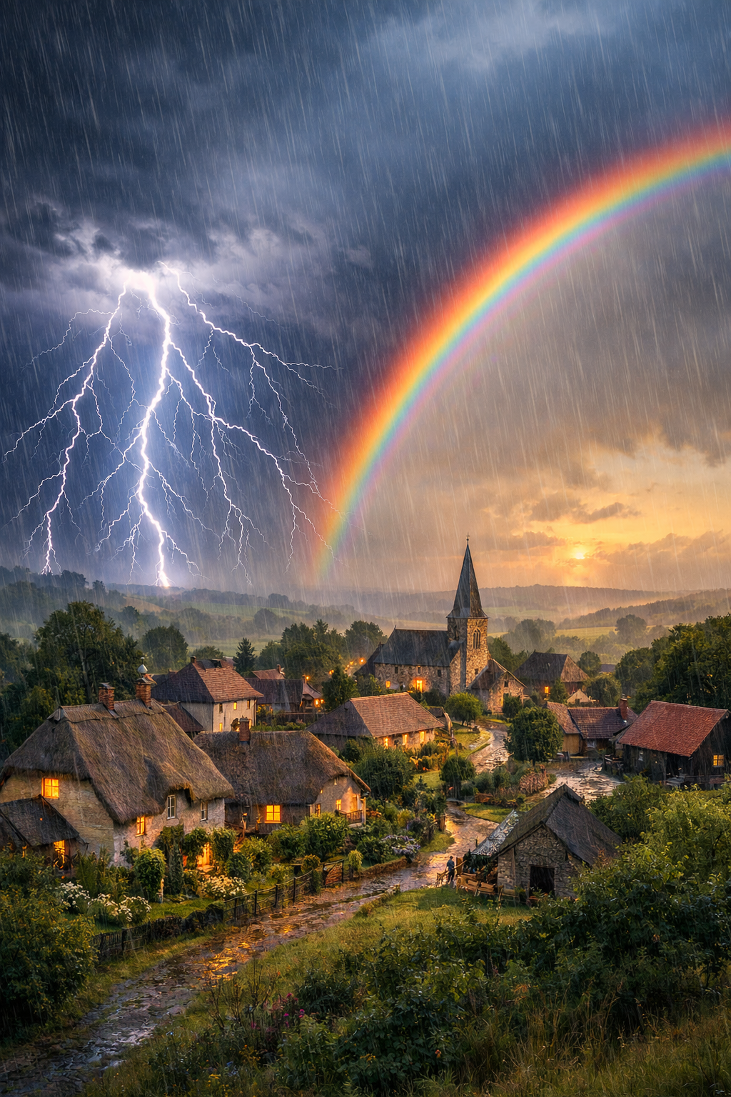 Et tordenvejr, hvis lige ikke er set i mands minde, hærger Midtland, lyn oplyser himlen, tordenskrald så voldsomme at det lyder som om guderne råber, genlyder i landskabet. Selv de mest frygtløse orker søger ly, intet rovdyr vover sig ud i natten. Intet liv er at spore i skoven, det er som om alle instinkter siger "Skjul dig!" De få som tør kigge ud gennem skodderne for vinduerne, sværger, at de ser en regnbue, selvom det er nat.